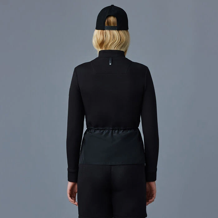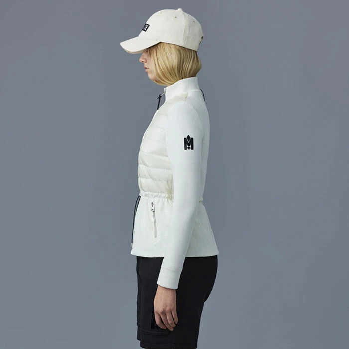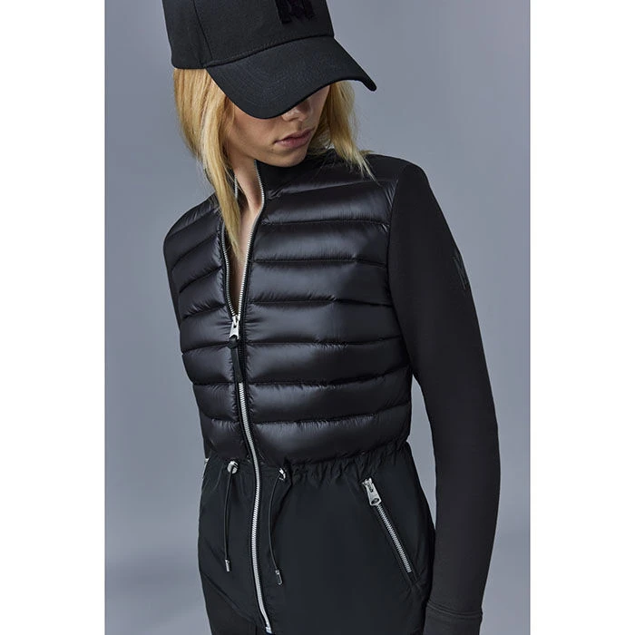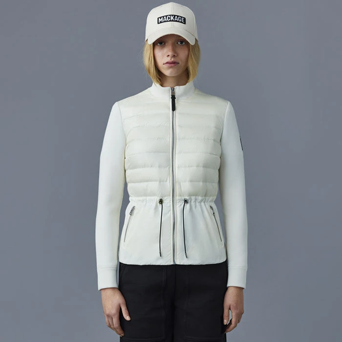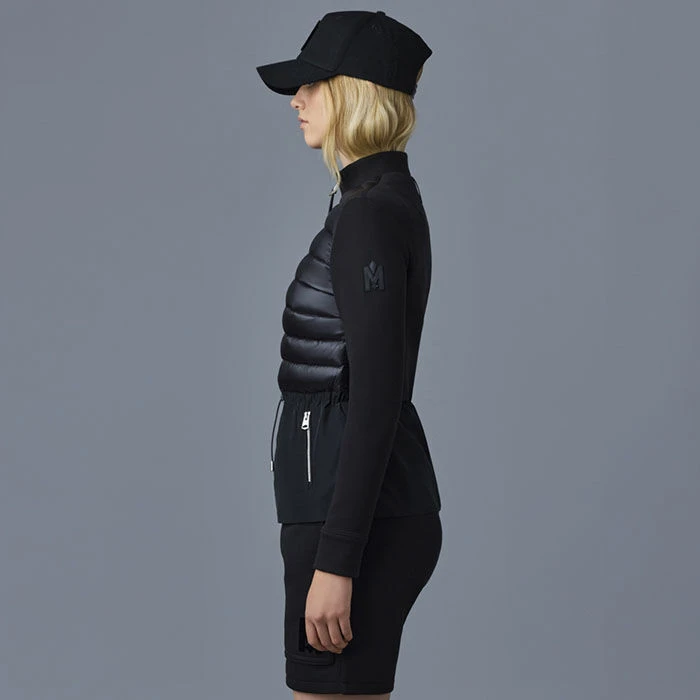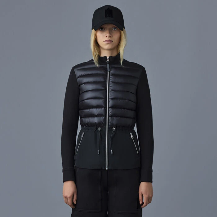 The Mackage Joyce Cardigan is a mixed-media jacket for women featuring a rainwear peplum and recycled lustrous light down front. An expertly tailored indoor-outdoor style, soft double-face jersey accents the sleeves, back and collar. Perfect for everyday, the drawcord waist lends a custom fit and cinched silhouette.