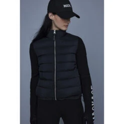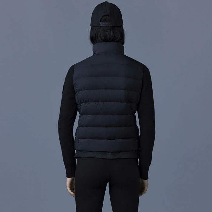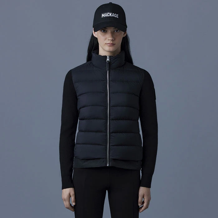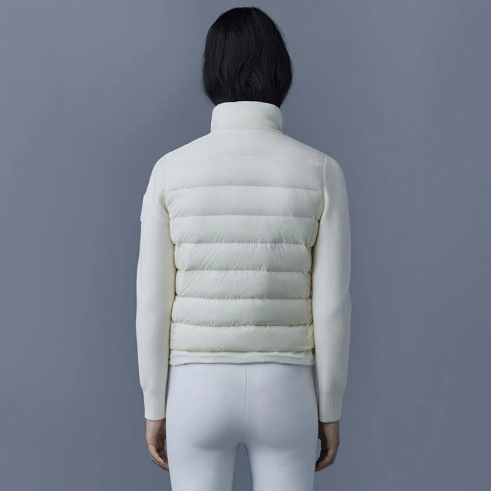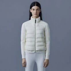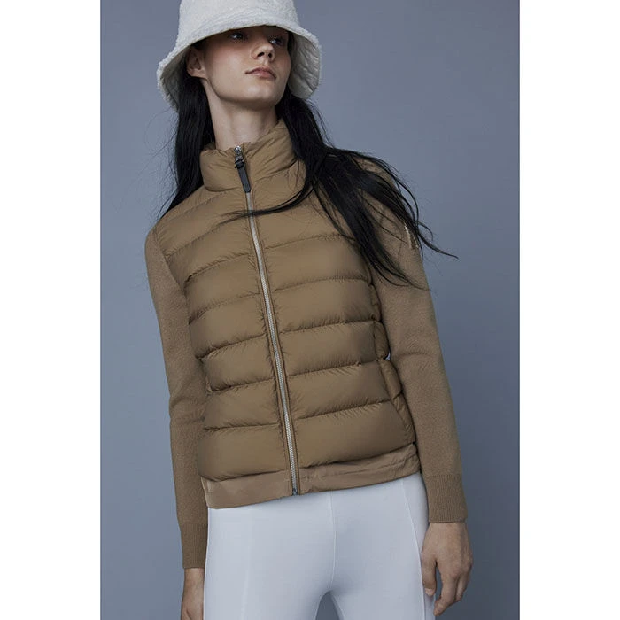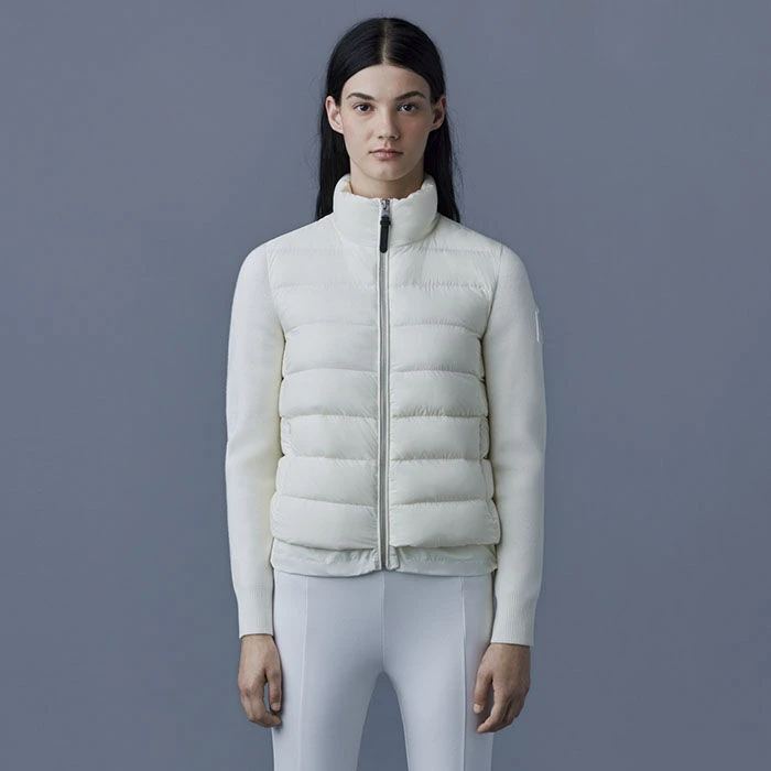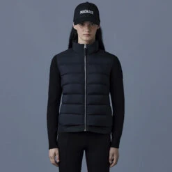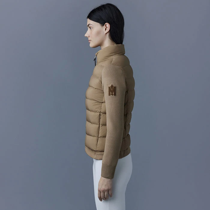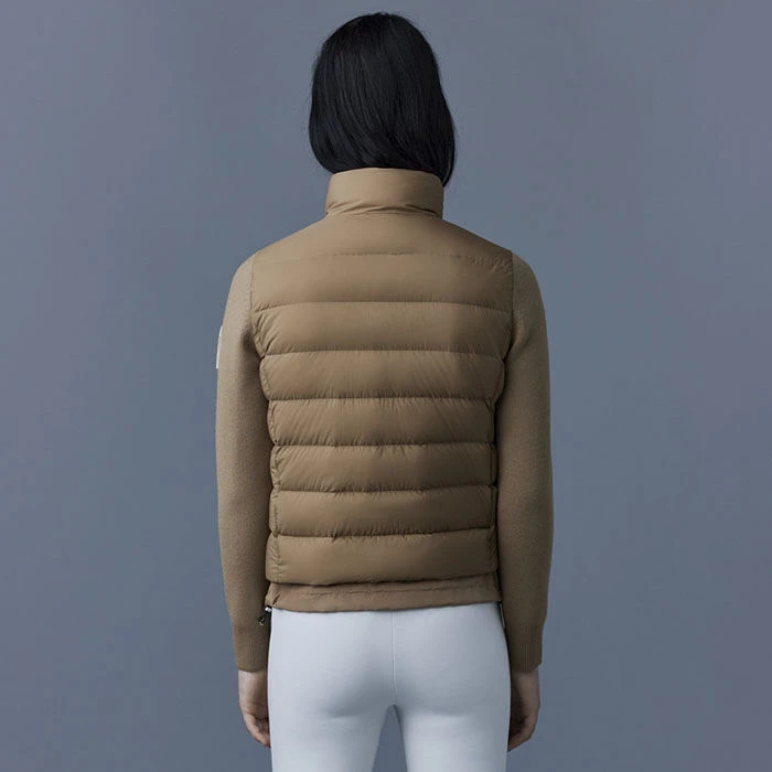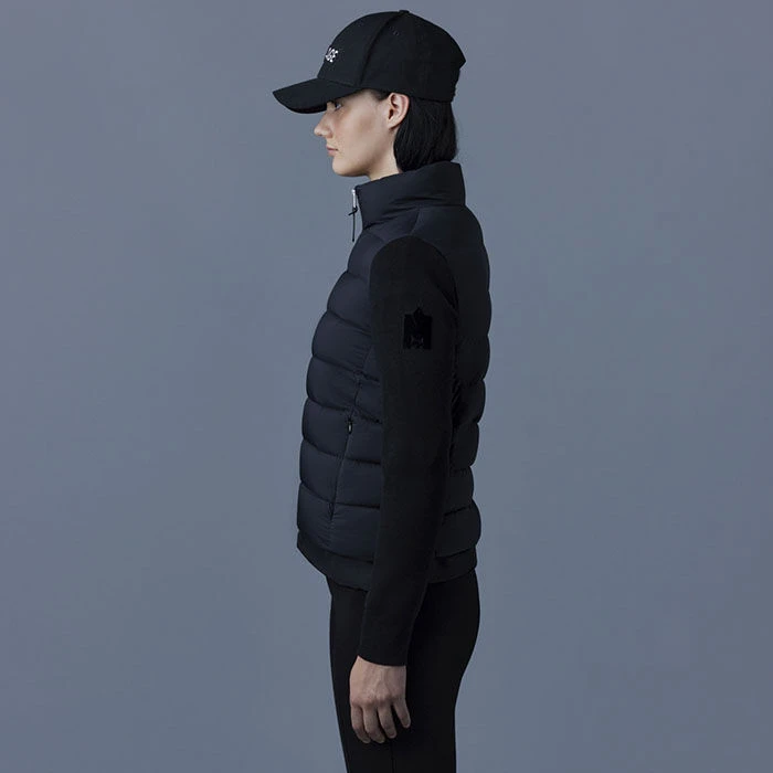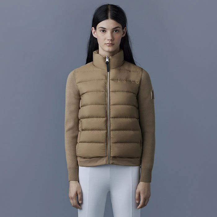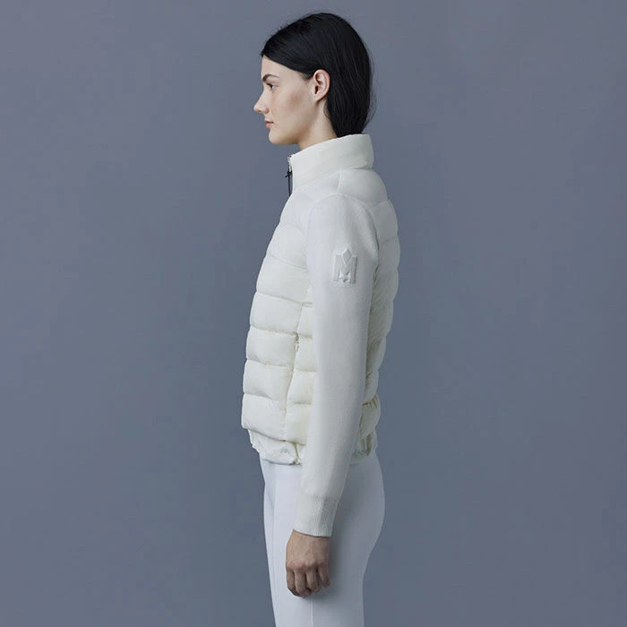 The Mackage Oceane Cardigan is a mixed-media jacket for women combining the warmth of featherlight recycled nano down with the comfort of soft knit sleeves. It’s a transitional style with a recycled channel quilt shell and a stand collar. The contrast weave hem features an adjustable drawcord while invisible zip pockets add function.
