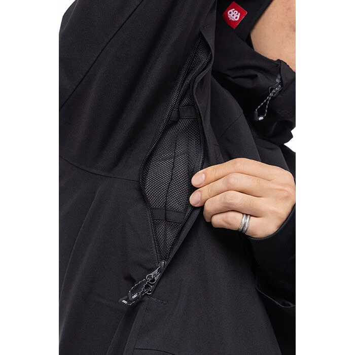 Jacket hood with technically constructed, laminated and perforated front collar venting system.