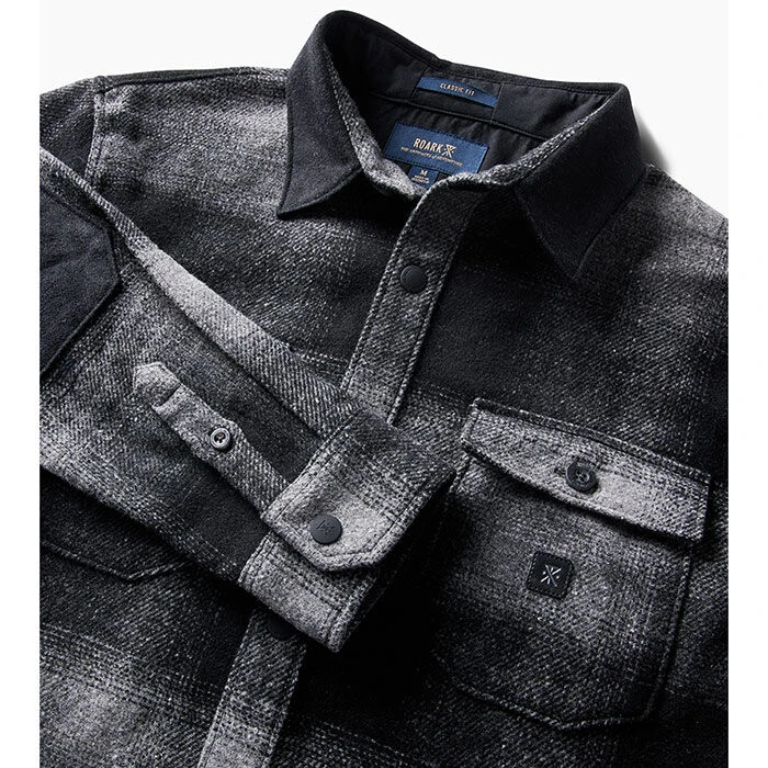 The Nordsman Flannel from Roark takes you from campsite to lunch date with ease. It features poly-wool blend fabric with reinforced elbows, front snap closure and buttoned pockets.