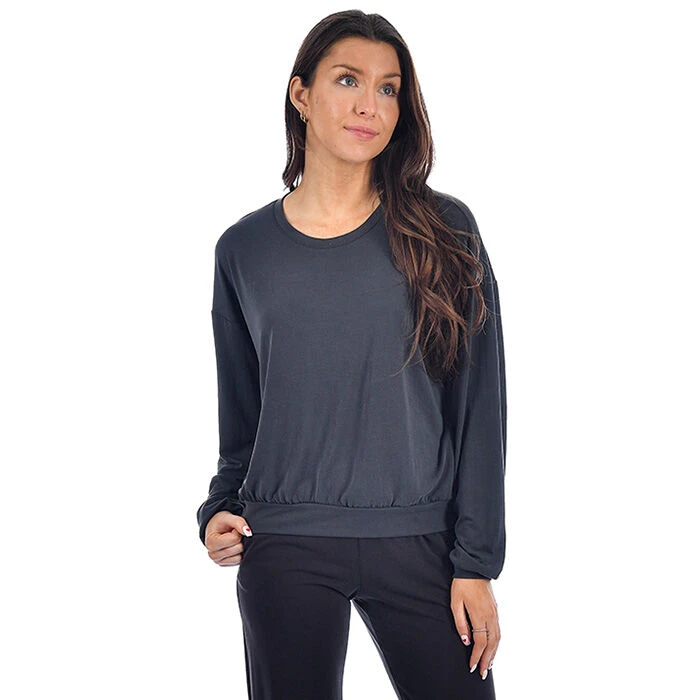This Oak & Ivy top is an everyday classic. It’s made from soft modal-poly fabric with a rounded collar, dropped shoulders and ribbed trim at the cuffs and hem.